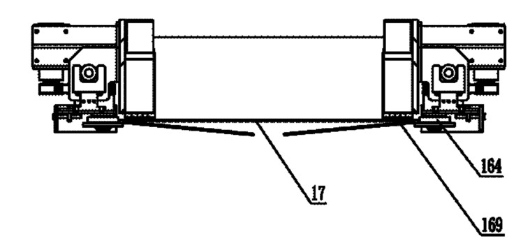 根据纸板的尺寸规格通过滚珠丝杆调节左、右横梁14、15之间的间距,使成形轮机构16到达合适的位置,在风箱162的吸力作用下,开槽(模切)后的纸板17被吸在输送皮带166下,由传动轴10带动输送皮带166把纸板17往前输送,经导向板168,沿着纸板17的开槽(模切)线,把纸板17输送到成形轮164,成形轮164由传动轴10通过传动装置13带动转动,利用成形轮164凸缘的斜面对纸板17进行折叠,并且利用成形轮164的斜面逐个趋于平直,来逐渐对纸板17进行折叠并最终成形,同时把预先涂有粘合剂的接口粘合起来。