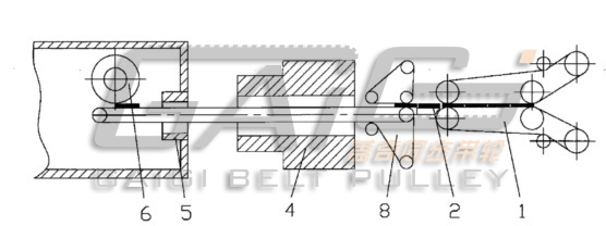 目前,滴灌带生产线中将滴头输送到滴灌带的装置如附图一所示:滴头由滴头输送履带 1 在紧密排列的状态下输送到第一输送履带 8 ,第一输送履带 8 的转速大于滴头输送履带 1 ,而第一输送履带 8 的运动线速度等于滴灌带生产过程中滴头粘接胶轮 6 的运动线速度,利用第一输送履带 8 与滴头输送履带 1 之间的速度差,滴头在进入挤出模具和冷却定形模具内之前,每个滴头之间的间距被固定在设定的范围内;其缺陷在于:第一输送履带 8 包括同步带、同步齿轮组以及多个轴承,由于挤出模具和冷却定形模具内的温度较高,导致第一输送履带 8 易老损而使用寿命较短,同时由于同步带、同步齿轮组以及多个轴承也易磨损而导致故障率高,这样就需要经常更换同步带、同步齿轮等部分,从而影响生产的正常进行,也就影响了单位时间生产滴灌带的产量。