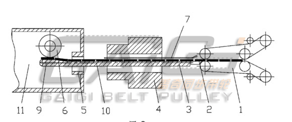 附图中的编码分别为: 1 为滴头输送履带, 2 为滴头, 3 为滴头输送导杆, 4 为挤出模具, 5 为冷却定形模具, 6 为滴头粘接胶轮, 7 为压板, 8 为第一输送履带, 9 为导杆头, 10 为导杆柄, 11 为冷却定形模具内腔。