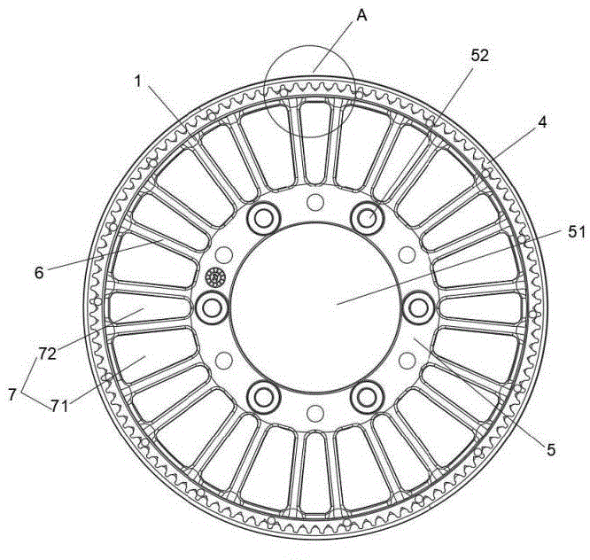 图中:1—带轮本体、2—轮齿、3—轮齿槽、31—导屑槽、4—环形挡圈、5—安装环、51—安装孔、52—连接孔、6—加强筋、7—减重孔、71—第一通孔、72—第二通孔。