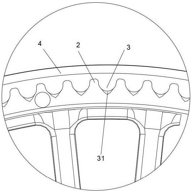 轮齿槽3位于两个轮齿2的齿根部,导屑槽31开设在轮齿槽3中,由于将导屑槽31设置在轮齿槽3中,因此不会影响整个同步带传统系统的工作,而且加工时可实现一次成型,减少了加工过程中对带轮齿2的影响,从而保证了传动系统的传动效率,当有砂石异物卡入同步带轮与同步带之间时,由于导屑槽31的设置,能使砂石异物随同步带轮的转动下而自动从导屑槽31内排出,无需额外的动力就可以实现砂石异物的自动清洗,从而降低了操作人员的工作强度,能提高同步带轮的使用寿命。