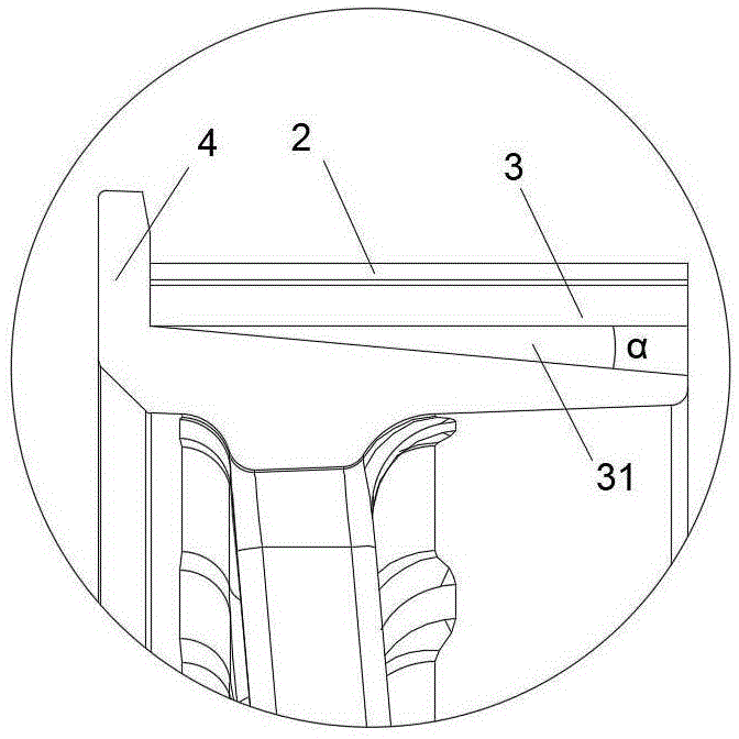 3.根据权利要求2所述的一种同步带轮STD齿形结构,其特征在于,任意所述轮齿槽(3)中都开设有导屑槽(31),所述导屑槽(31)从环形挡圈(4)的一侧向着另一侧倾斜,所述导屑槽(31)与水平线的倾斜角度α为3-20°。