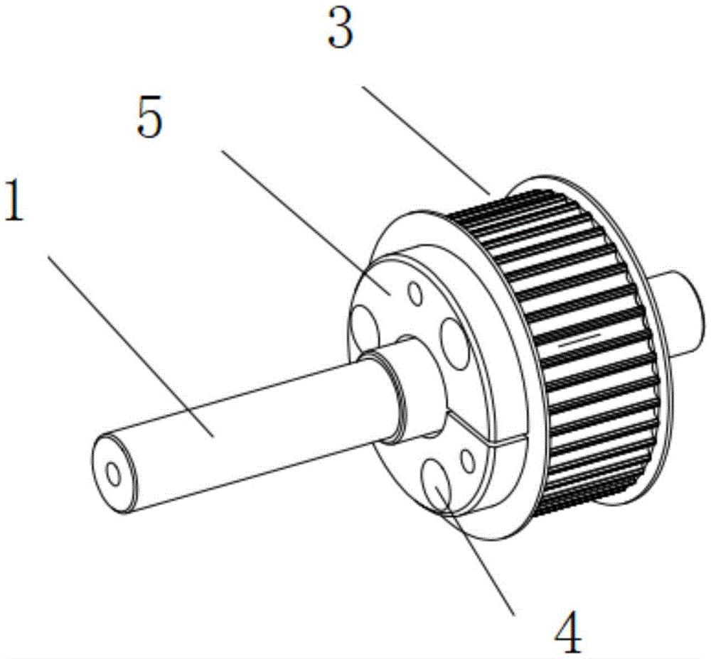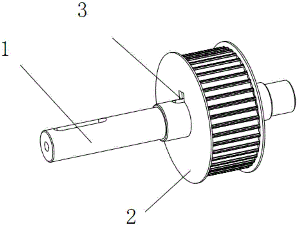 片材成型时,需要用到机械手自动吸成型品,机械手结构中包括同步带及同步带轮,当前同步带轮结构,如图1所示,是一根旋转轴1和同步带轮3相结合,中间通过键槽2固定位置,然后用顶丝锁紧键槽位置,当长时间生产时顶丝经常锁不紧,键槽和同步带轮发生窜动,导致同步带易磨损和断裂,同时同步带轮也会磨损严重,造成更换同步带及同步带轮次数增加,维修费用增多,造成设备异常停机时间多,生产效率降低。