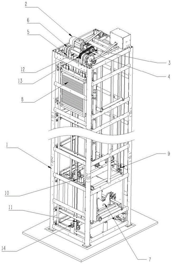 如图1-2所示,一种极片库用同步带框架提升机,包括提升机框架1,提升机框架1顶部设有提升电机2,提升电机2驱动端设有与之连接的链轮3,链轮3通过链条4与设置于提升电机2一侧转轴12上的从动链轮13连接,转轴12两端均设有同步带惰轮6,其上套装有同步带5,且同步带5一端与设置于提升机框架1内的轿厢7连接,其另一端与设置于提升机框架1一侧的配重块8连接。