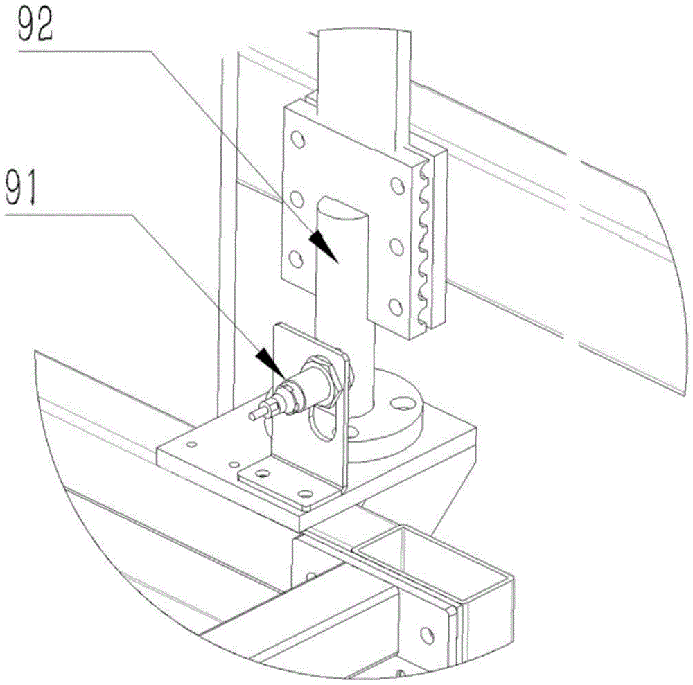 3.根据权利要求2所述的极片库用同步带框架提升机,其特征在于:所述断绳检测装置(9)包括接近开关(91)及弹簧复位机构(92)。