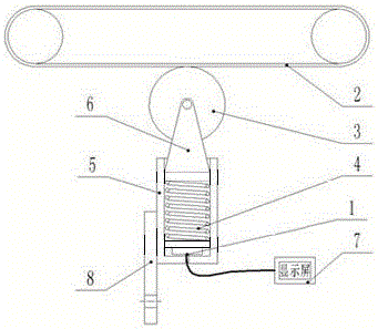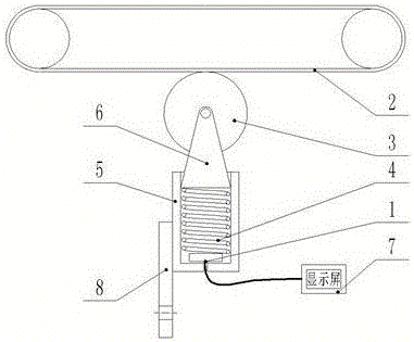 图中:1、压力传感器;2、同步带;3、导轮;4、压簧;5、套管;6、导轮支架;7、显示屏;8、固定支架。