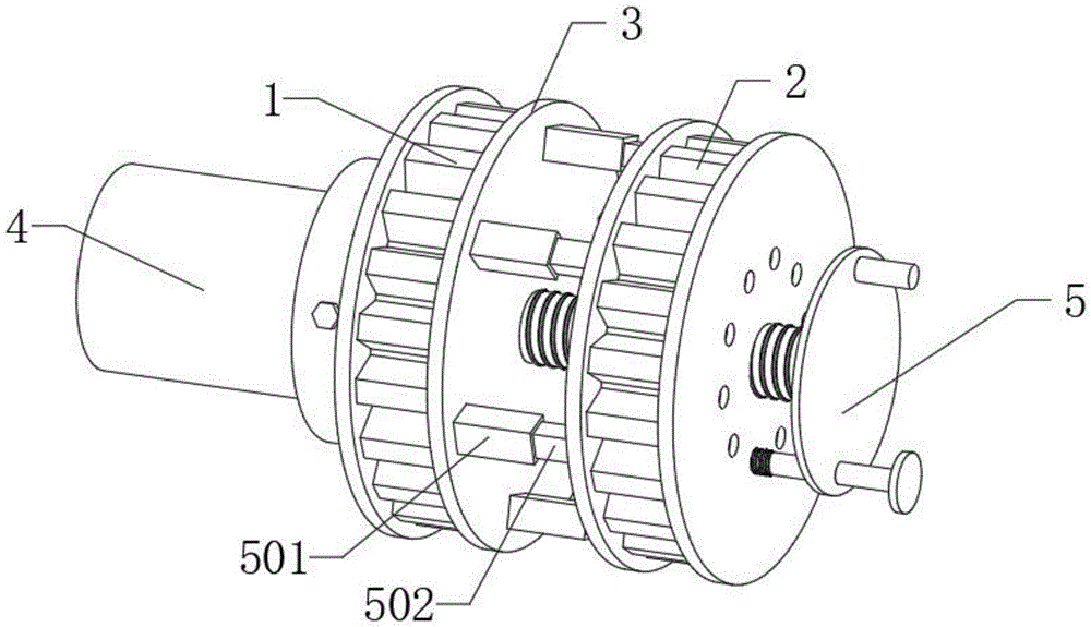 3.根据权利要求2所述的用于精密传动系统的双齿同步带轮,其特征在于,所述插杆(507)一端固定连接有旋转块(508),所述插杆(507)与插孔(505)直径相同。