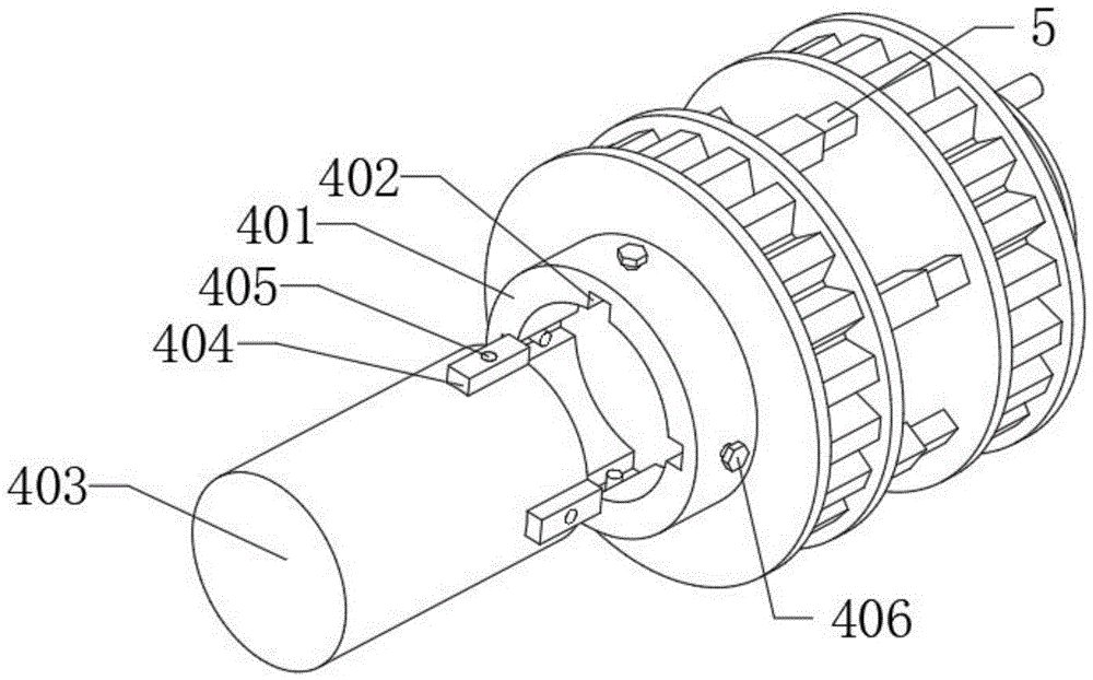 为了更好地使连接轴403与固定座401之间相互连接,固定座401内均匀开设有限位槽402,连接轴403表面均匀固定连接有限位块404,限位块404与限位槽402尺寸相同。将限位块404插入限位槽402内,避免连接轴403与固定座401之间发生滑动。