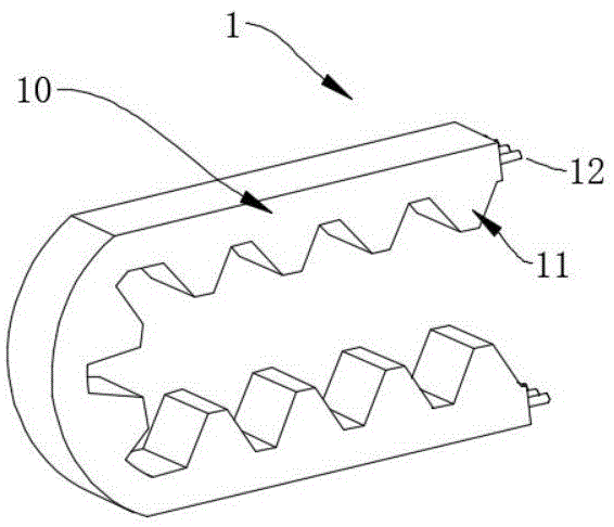 具体的,散热孔21设置为锥形结构,且每两组散热块20上的散热孔21相交错设置,在带体10带动散热块20转动的时候,散热孔21的锥形结构使得风可以形成一定的冲击力,吹在下一个散热块20上,提高了散热块20的散热效果。