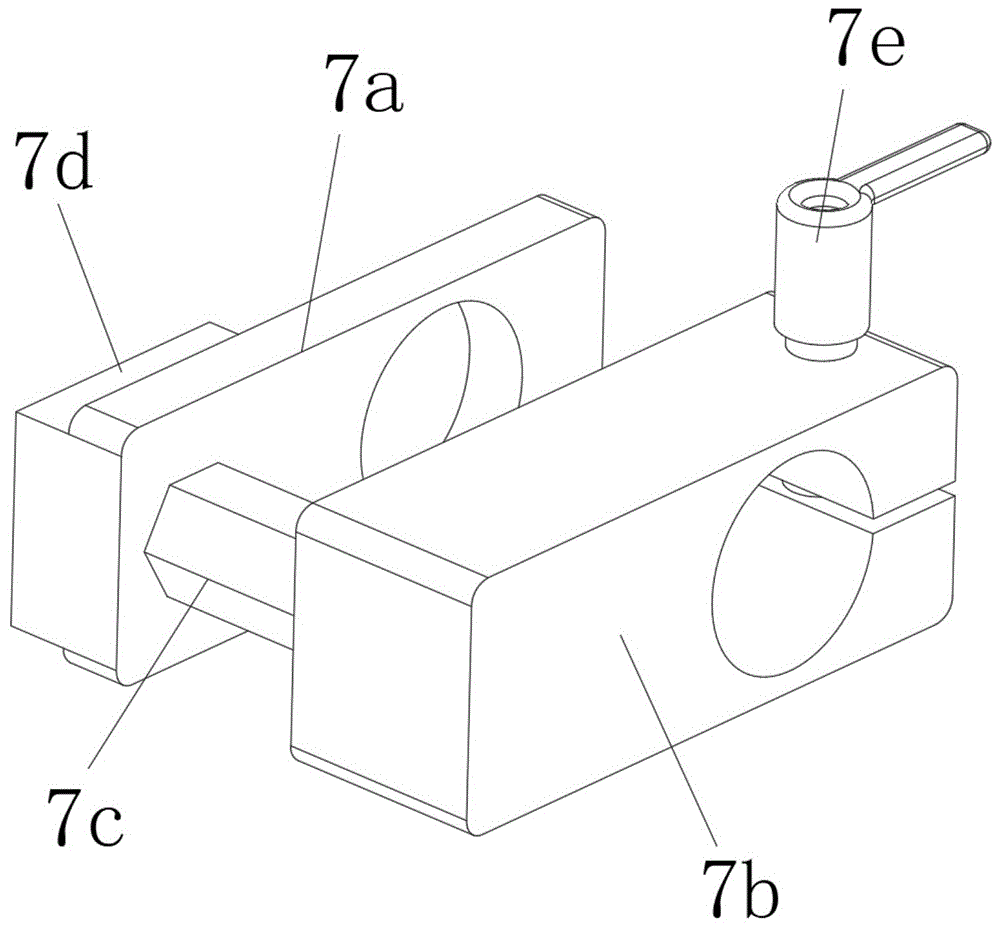 所述锁紧块(7)包括导向部(7a)、锁紧部(7b)和连接部(7c),所述导向部(7a)和所述锁紧部(7b)通过连接部(7c)相连接,所述安装板(1)上设有水平槽,所述第一调节轴(2)贯穿所述水平槽,所述导向部(7a)一侧设有凸块(7d),所述凸块(7d)与水平槽相对应,所述导向部(7a)和所述锁紧部(7b)上均设有通孔,所述第一调节轴(2)贯穿该通孔,所述锁紧部(7b)的通孔一侧设有缝隙,所述锁紧部(7b)上设有锁紧螺栓(7e)。