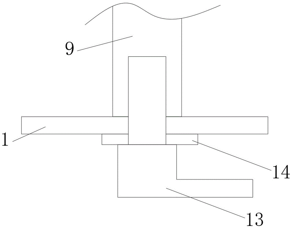 具体的,第二调节轴9两端设有螺孔,与锁紧手柄13相对应,锁紧手柄13靠近安装板1一侧设有垫片14,通过拧紧锁紧手柄13,压迫垫片14与安装板1实现第二调节轴9的固定,当需要调整第二调节轴9的位置则松开锁紧手柄13。