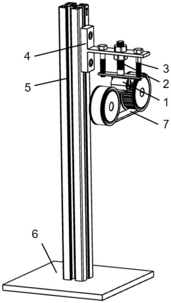 具体的,请参阅图1至图3,在本申请的实施例中,提出了一种同步带7张紧机构,该机构专门设计用于对传动轮上的同步带7进行有效的张紧操作。该机构包括几个关键组成部分:张紧轮1、上下调节构件2以及固定构件4。具体来说,张紧轮1被安置在传动轮的上方位置,它能够直接接触并施加压力于传动轮上同步带7的表面。为了实现对张紧轮1位置的精确调整,上下调节构件2与张紧轮1相连,使得用户可以根据需要在垂直方向上移动张紧轮1。此外,固定构件4与上下调节构件2相连接,其主要作用是支撑和固定上下调节构件2,确保整个张紧机构的稳定性和可靠性。当同步带7需要进行张紧操作时,用户可以通过调整上下调节构件2,从而使得张紧轮1能够更加紧密地抵接在同步带7的表面,确保传动效率和同步带7的使用寿命。