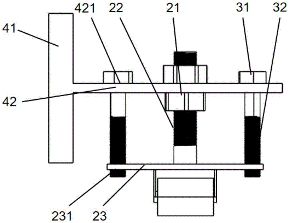 2、上下调节构件;21、第一螺帽;22、第一螺杆;23、连接板;231、第二安装孔;