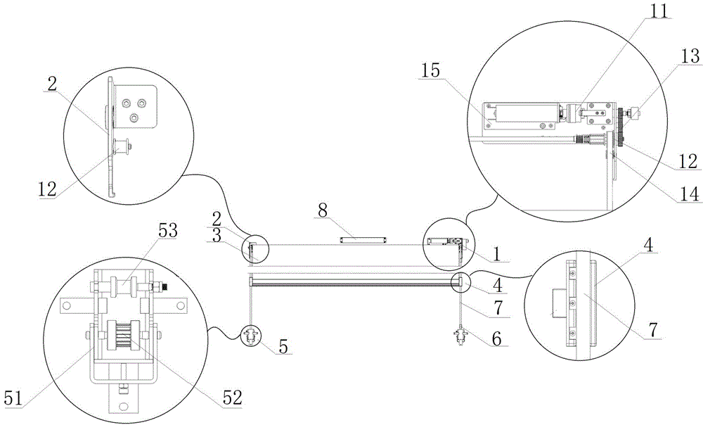 图中:1、右支撑;11、驱动系统;111、直线电机;112、限位块;113、电磁离合器;114、轴承座;115、位置传感器;12、同步轮;13、齿轮组;121、齿轮Ⅰ;122、齿轮Ⅲ;123、齿轮Ⅱ;14、导向轮;15、安装座;2、左支撑;3、卷筒;31、芯轴;32、堵头;33、支撑块;34、卷簧;4、拉杆;5、从动轮;51、支架;52、滑轮;53、预紧轮;6、限位传感器;7、同步带;8、控制器。