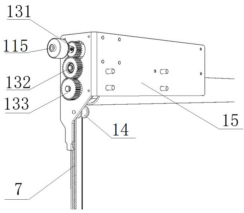 本技术方案中,壳体防止灰尘、水分等杂质进入,同时支撑齿轮组13之间的相对位置;齿轮Ⅰ121与轴承座114的输出端相连,将旋转动力传递给齿轮Ⅲ122;齿轮Ⅲ122与齿轮Ⅱ123,将旋转动力传递给齿轮Ⅱ123;齿轮Ⅱ123与芯轴31的右侧末端相连,将旋转动力传递给芯轴31;芯轴31上有同步轮12,同步轮12将动力传递给同步带7。位置传感器115通常为电磁感应传感器、光电传感器,实时监测齿轮Ⅰ121的旋转状态,并将监测到的信号转换为电信号,传递给控制器8。