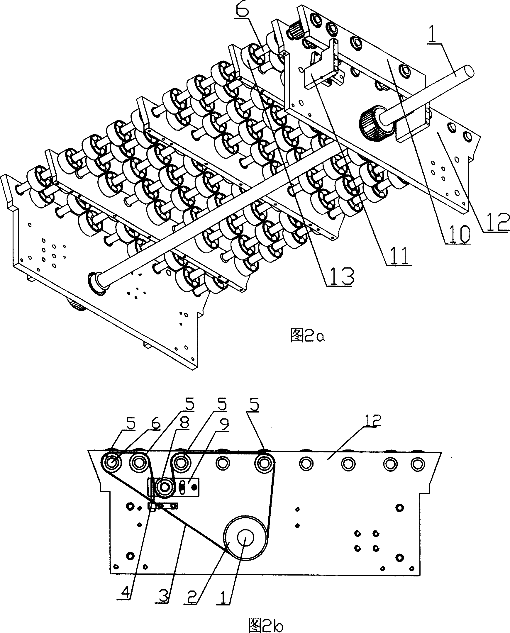 参照图1a、图1b、图2a、图2b、图3,本发明实施例的圆弧齿 同步大带轮2装在主轴1上,圆弧齿同步小带轮5、传送轮13装在 滚轮传动轴6上,张紧轮8装在张紧轮座9,张紧轮座9与张紧轮7 装在吸风箱左右侧封板12上,圆弧齿同步大带轮2通过圆弧齿同步 带3带动各个圆弧齿同步小带轮5转动,张紧轮8通过调整螺钉4与 张紧轮7调整圆弧齿同步带3的张力。整个传动装置由吸风箱带轮轴 承板10和吸风箱左右侧封板12支承,由吸风箱带轮固定支板11固 定,两组传动装置分布于吸风箱左右侧封板12的外侧,联合驱动9 组传送轮13同时转动。