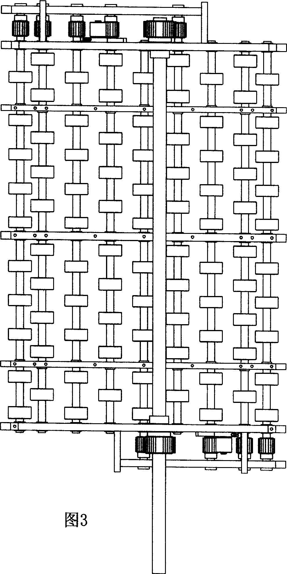本发明靠齿啮合传动,传动比准确,传动效率高,初张紧力最小, 轴承承受压力最小,瞬时速度均匀,保证了各组传送轮的转速一致性; 耐冲击振动较好,使系统的传动更平稳;结构紧凑、安装维修简便。