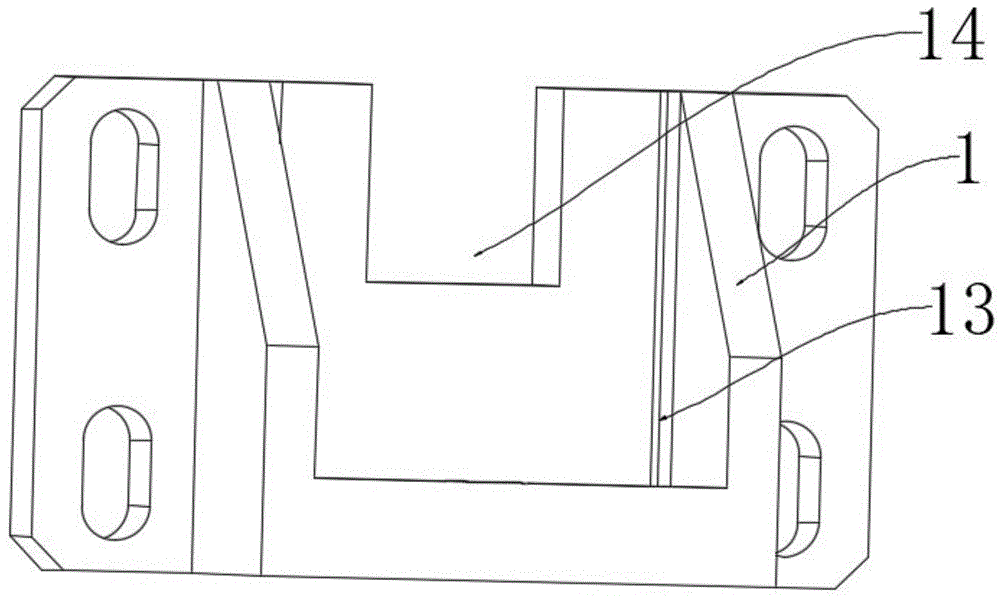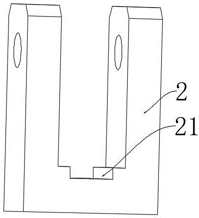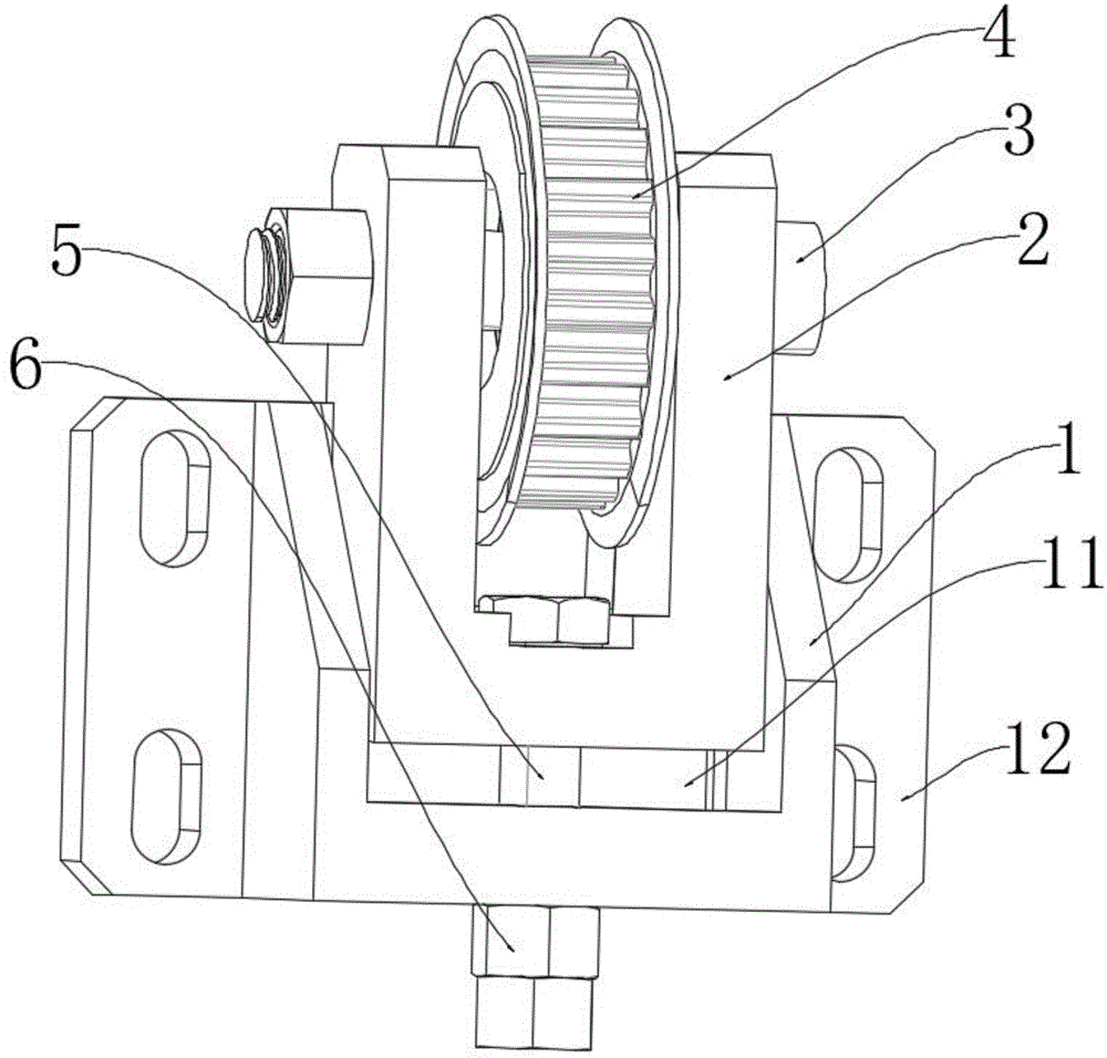 其中:1-固定座,11-安装槽,12-支耳,13-限位凸缘,14-让位口,2-轴座,21-凹槽,3-轴杆,4-连接轮,5-调节螺栓,6-螺母。