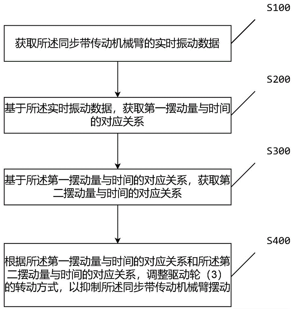 1.一种同步带传动机械臂启停摆动抑制方法,其特征在于,包括:获取所述同步带传动机械臂的实时振动数据;基于所述实时振动数据,获取第一摆动量与时间的对应关系;基于所述第一摆动量与时间的对应关系,获取第二摆动量与时间的对应关系;根据所述第一摆动量与时间的对应关系和所述第二摆动量与时间的对应关系,调整驱动轮(3)的转动方式,以抑制所述同步带传动机械臂摆动。