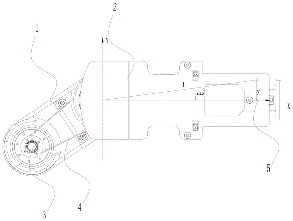 在本实施例中,参见图3,X轴是第二机械臂2自然状态下的位置,第二机械臂2上具有摆动测量点5,摆动测量点5摆动后与X轴的相对距离为y,摆动测量点5与第二机械臂2旋转点的距离为L。