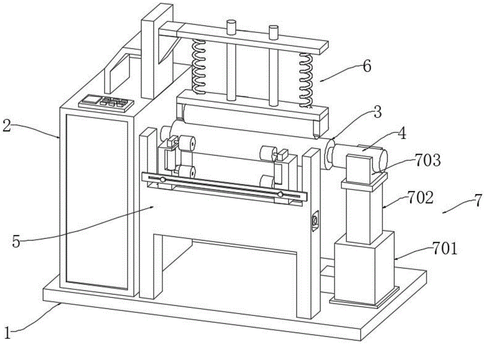 请参阅图1,收卷底板1上方的一侧固定安装有设备箱2,设备箱2的一侧转动安装有收卷轴3,收卷轴3设置为气胀轴,用于聚氨酯同步带收卷筒的安放和固定,设备箱2的内部设置有收卷轴3的驱动电机,收卷轴3的一侧转动安装有侧柱4,侧柱4的下方设置有支撑架7,支撑架7包括底箱701、升降条板702和垫块703,底箱701与收卷底板1固定连接,升降条板702设置于底箱701的上方,且升降条板702的下端穿进底箱701的内部,底箱701的内部固定安装于用于驱动升降条板702升降移动的电动缸,垫块703固定安装于升降条板702的上方,垫块703的上端面上设置有弧形凹槽,有利于垫块703和侧柱4稳定接触。