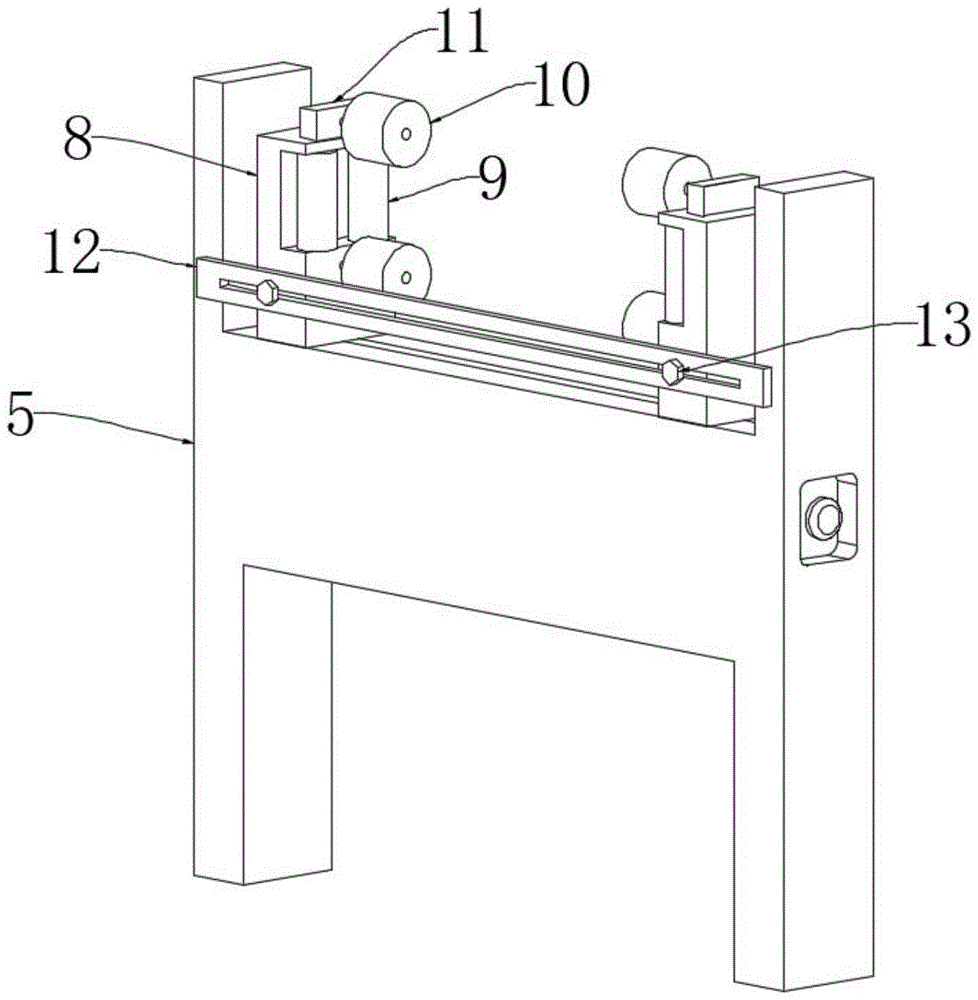 通过长条板12和固定螺栓13的设置,通过简单地松开和拧紧固定螺栓13,方便两个限位板8之间的距离调整后的固定,以适应不同宽度的聚氨酯同步带,不仅提高了收卷架的适用性和灵活性,还确保了同步带在收卷过程中能够受到均匀的引导和限制,从而有效防止偏斜。