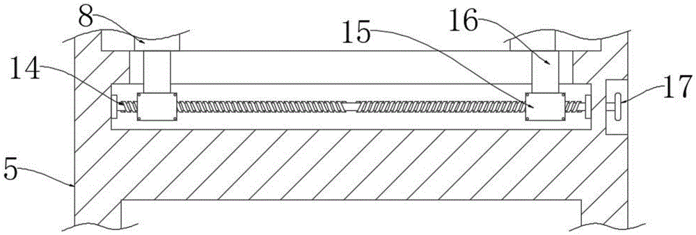 请参阅图2和图3,引导板5的内部设置有丝杆腔,引导板5的丝杆腔内部转动安装有滚珠丝杆14,滚珠丝杆14外侧两端的螺纹相反设置,滚珠丝杆14外侧的两端分别对称滑动安装有滑动块15,滑动块15的上固定安装有传动板16,传动板16的上端与限位板8固定连接,引导板5的一侧设置有手轮槽,引导板5的手轮槽内部设置有手轮17,手轮17的一侧固定安装有连接杆,且连接杆与滚珠丝杆14固定连接。