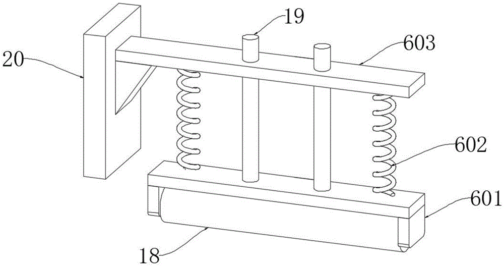 请参阅图1和图4,收卷轴3的上方设置有压架6,压架6包括辊架601、压缩弹簧602和顶板603,压缩弹簧602设置有两个,且两个压缩弹簧602对称设置于辊架601和顶板603之间,顶板603的一侧固定安装有立板20,立板20的下端与设备箱2固定连接,辊架601的内侧转动安装有压辊18,压辊18用于弹性下压收卷的聚氨酯同步带,辊架601的上方固定安装有导柱19,导柱19的上端滑动贯穿顶板603。
