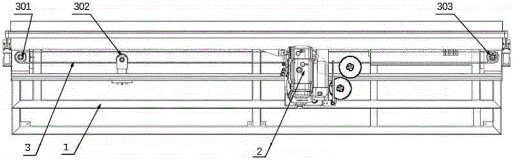 如图1-图4所示,本实用新型提供一种接布机用双张紧同步带驱动机构,安装在接布机上;接布机包括机架1、机头2、以及同步带3,同步带驱动机构安装在机架1上,机头2连接在同步带3上,同步带驱动机构通过同步带3驱动机头2在机架1上左右移动;同步带驱动机构包括惰轮组件、张紧轮组件、以及主动轮组件,同步带3依次穿过惰轮组件上的惰轮301、张紧轮组件上的张紧轮302、以及主动轮组件上的主动轮303,且同步带3形成闭合环形;惰轮301在惰轮组件上左右方向上的位置可调节;张紧轮302在张紧轮组件上前后方向的位置可调节。