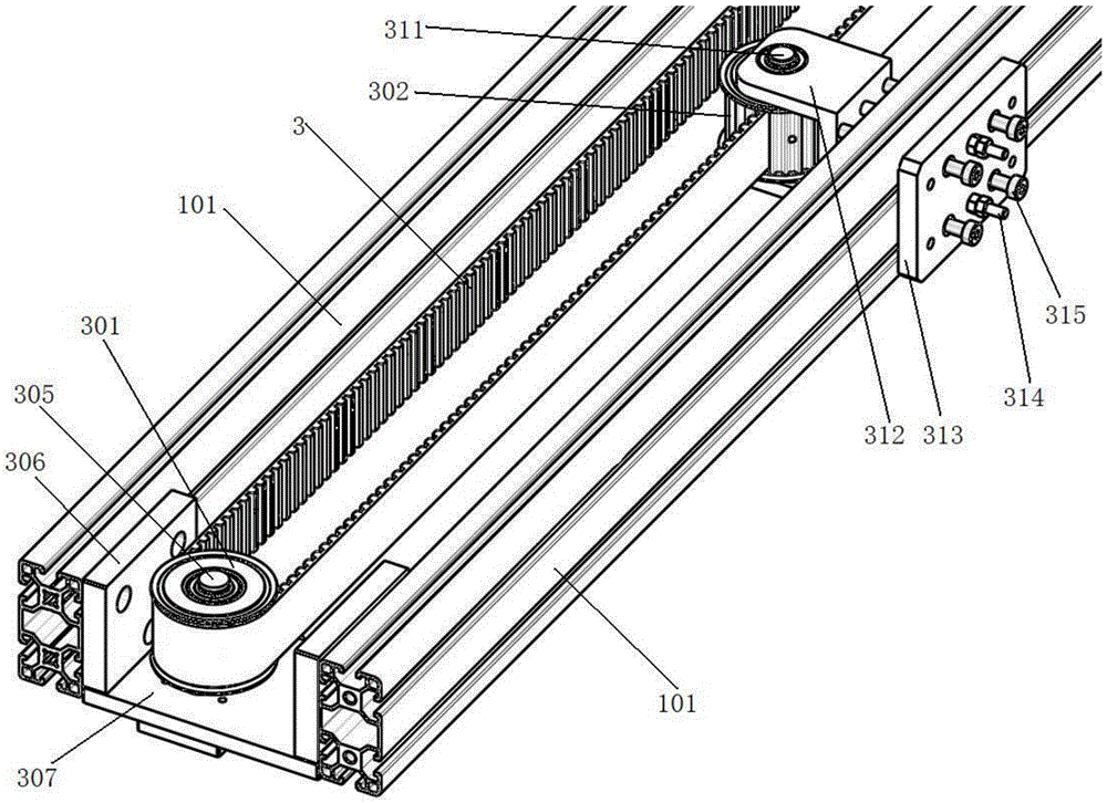 优选的,如图1、图2所示,张紧轮组件包括张紧轮302、张紧轮轴311、张紧轮移动块312、张紧调节底板313、张紧圆柱315、张紧调节螺丝314、以及张紧调节螺母,张紧轮302通过张紧轮轴311可旋转设置在张紧轮移动块312中;张紧圆柱315设置在张紧轮移动块312上且沿前后方向贯穿机架1的滑轨安装型材101及张紧调节底板313;张紧调节螺丝314的前端与张紧轮移动块312固定连接,后端贯穿滑轨安装型材101及张紧调节底板313;张紧调节螺母设置在张紧调节螺丝314的后端。
