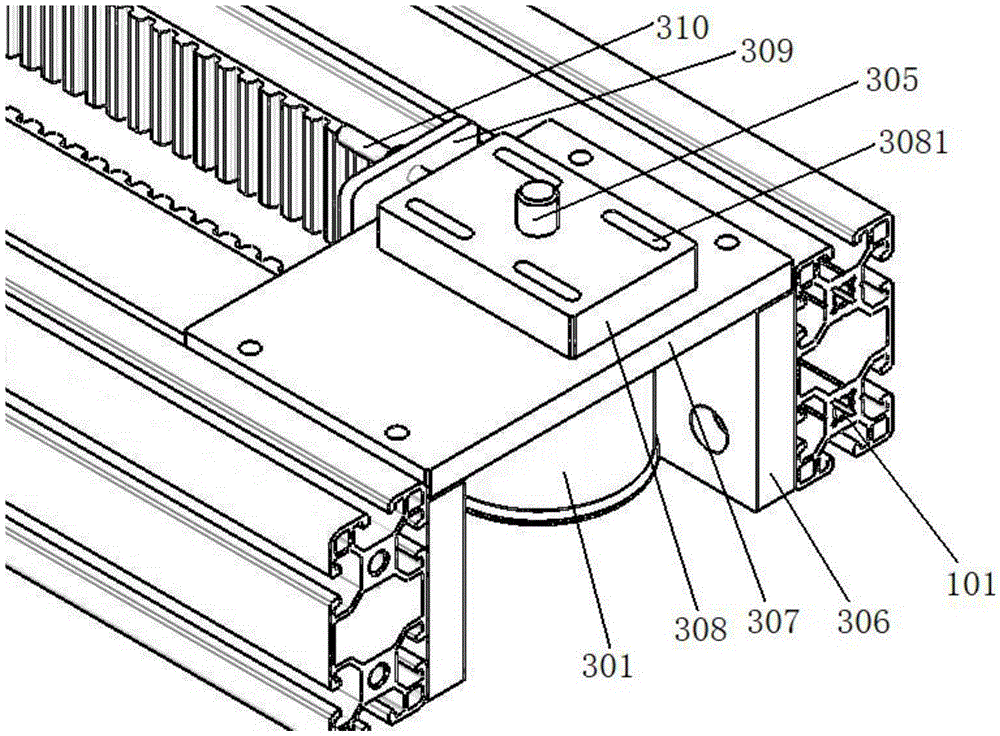 优选的,如图1-图3所示,惰轮组件包括惰轮301、惰轮轴305、惰轮调节板308、以及惰轮安装板307,惰轮安装板307固定在机架1的滑轨安装型材101上;惰轮轴305沿上下方向穿设在惰轮301的轴孔中,惰轮轴305贯穿惰轮安装板307且与惰轮调节板308固定连接;惰轮调节板308在惰轮安装板307上的左右位置可调节。在本实施例中,滑轨安装型材101的数量为两个,且两个滑轨安装型材101沿前后方向平行设置在机架1中,同步带3设置在两个滑轨安装型材101之间,移动组件沿滑轨安装型材101移动。惰轮安装板307的前后两端设置有惰轮连接板306,两个惰轮连接板306固定在滑轨安装型材101上,如此实现将惰轮安装板307连接在滑轨安装型材101上。