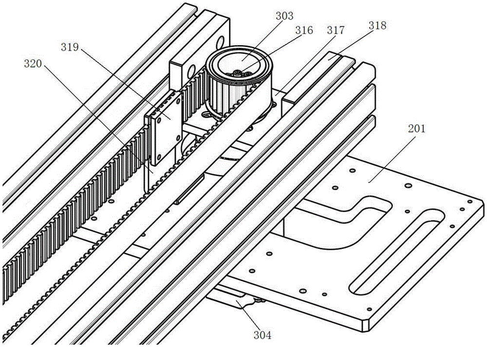 在本实施例中,主动轮驱动源304为伺服电机,主动轮驱动源304固定在驱动源固定板317的下端面上,主动轮驱动源304的电机轴贯穿驱动源固定板317,且通过胀套316与主动轮303连接,如此主动轮驱动源304的旋转将带动主动轮303转动,进而实现同步带3的转动。驱动源固定板317的前后两端设置有主动轮连接板318,两个主动轮连接板318固定在滑轨安装型材101上,如此实现将驱动源固定板317连接在滑轨安装型材101上。