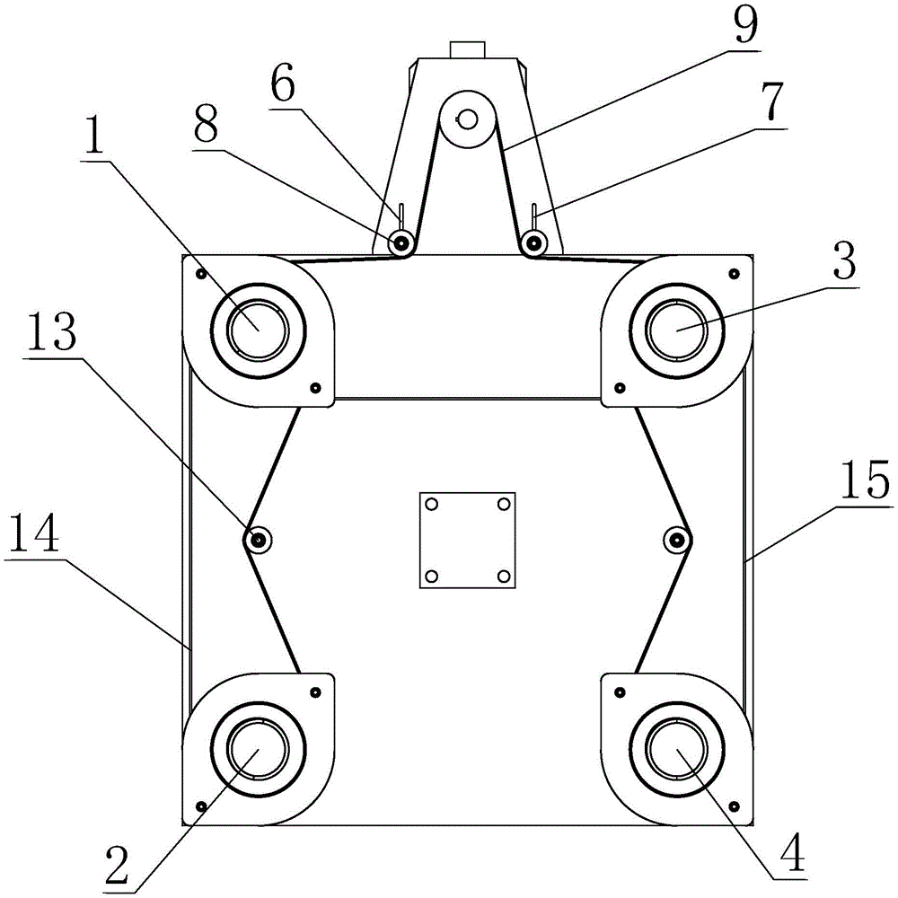 所述第二同步带14连接所述一号拉杆1和所述二号拉杆2,所述第三同步带15连接所述三号拉杆3所述和四号拉杆4。这两条同步带的作用是将所述一号拉杆1和所述三号拉杆3的旋转运动同步传递到所述二号拉杆2和所述四号拉杆4,保证所述后模板12的四角的同步运动,实现整体平行移动。