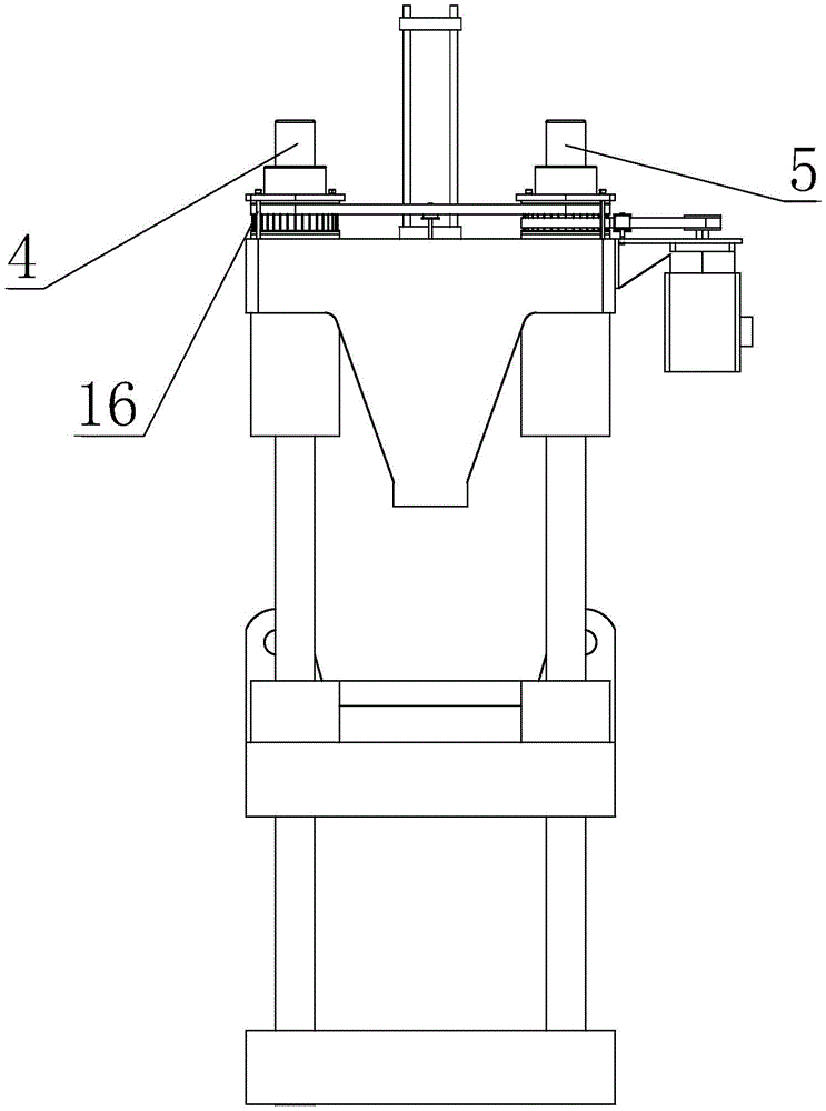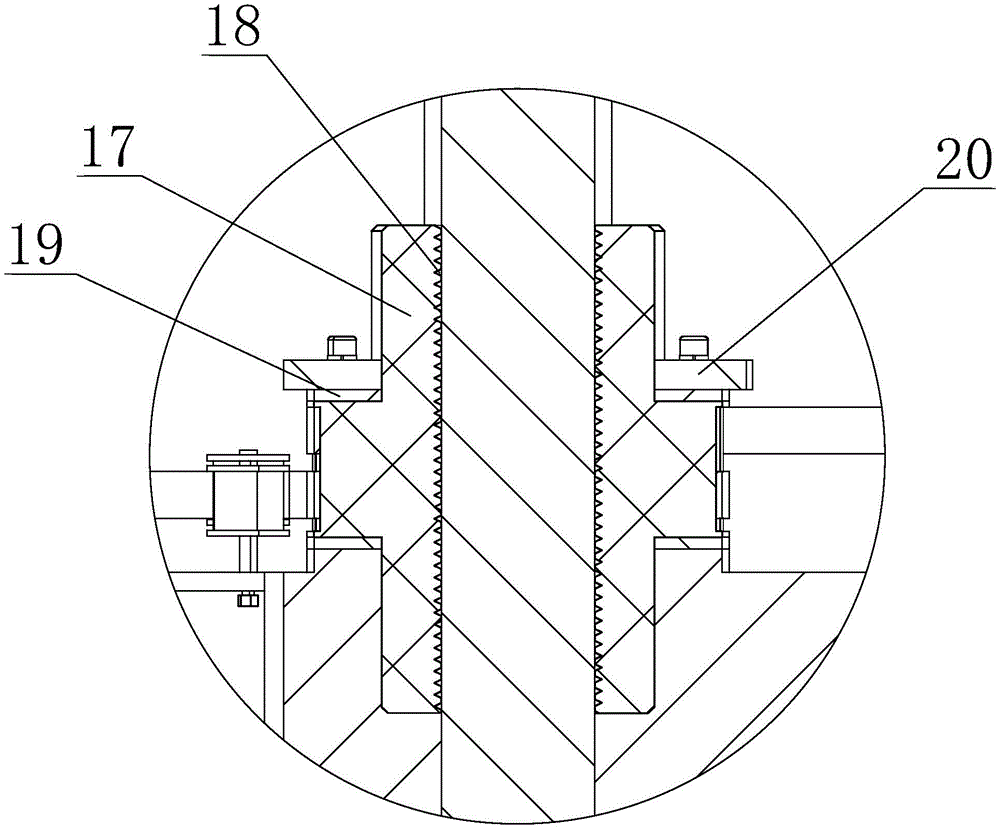 每根拉杆的外侧均套设有所述后螺母17,所述后螺母17与所述后模板12之间采用铰接连接。这种铰接连接允许所述后螺母17与所述后模板12之间产生相对转动,同时保持着所述后模板12与所述后螺母17的相对位置不发生改变。后螺母17的内侧加工有内螺纹18,与拉杆外侧的螺纹啮合,实现将所述后螺母17的转动转化为所述后模板12整体的直线运动。所述后螺母的外侧也设有与同步带啮合的齿形结构。